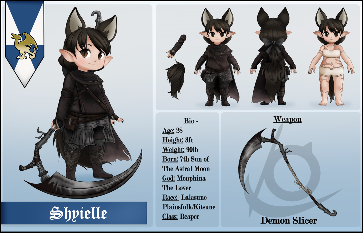 Shyielle grew up in The Black Shroud with her Kitsune mother Kiyomi and Lalafell father Lelehara. Having met in Kugane Lelehara took Kiyomi to Gridania in order to flee the garlean empire's scientist's and experiments. Once in the bows of the forest and with what money Lelehara had he was able to buy a small modest home. Nine months after a small wedding, Kiyomi gave birth to a very rare child, a Little Lalafellian girl, with large fox-like ears and a bushy fox tail, naming her Shyielle. In her formative years Lelehara taught her how to fight and maintain arms and armor, while Kiyomi taught her how to use her natural agility and what limited magical powers Shyielle inherited from her mother's blood.